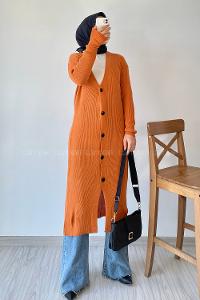 Modalamelif Önü Boydan Düğme Detaylı Fitilli Uzun Hırka Turuncu