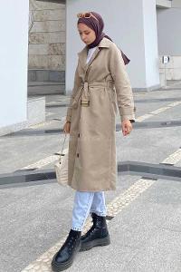 Lamelif Kol Kemerli Trençkot Vizonrengi