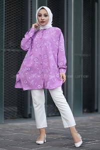 Modalamelif Önü Boydan Düğmeli Çiçek Desenli Yırtmaçlı Tunik Gömlek Lila