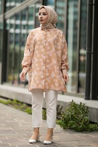 Modalamelif Önü Boydan Düğmeli Çiçek Desenli Yırtmaçlı Tunik Gömlek Sütlükahve