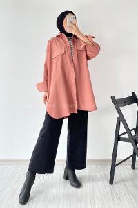 Modalamelif Önü Boydan Düğmeli Çift Kapak Cepli Dikiş Detaylı Gömlek Gül
