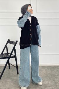Modalamelif Önü Boydan Düğmeli Kol Kot Garnili Triko Hırka Siyah