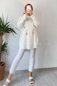 Modalamelif Önü Boydan Düğmeli Taş Detaylı Gömlek Ekru
