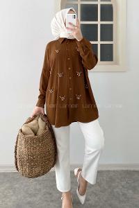 Modalamelif Önü Boydan Düğmeli Taş Modelli Gömlek Acı Kahve