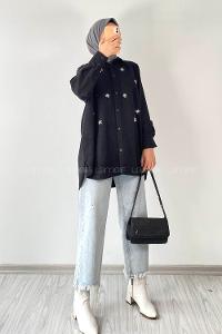 Modalamelif Önü Boydan Düğmeli Taşlı Oduncu Gömlek Siyah