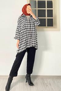 Modalamelif Önü Boydan Düğmeli Tek Cepli Ekose Desenli Tunik Beyaz-Siyah