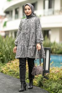 Modalamelif Önü Boydan Düğmeli Yazı Baskılı Fırfırlı Tunik Gri