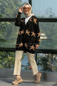 Modalamelif Önü Boydan Düğmeli Yıldız Desenli Triko Hırka Siyah