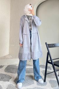 Modalamelif Önü Boydan Fermuar Detaylı Kapüşonlu Tunik Gri
