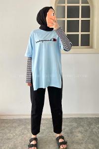 Lamelif Bsikilet Yaka İki İplik Tişört Saks Mavisi