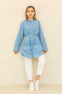 Modalamelif Önü Çıtçıt Düğmeli Kapşonlu Trenç Açık Mavi