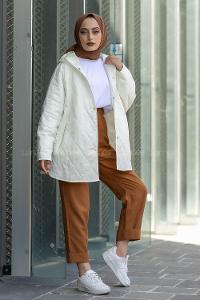 Modalamelif Önü Çıtçıt Düğmeli Kapüşon Detaylı Çift Cepli Salaş Ekru Mont