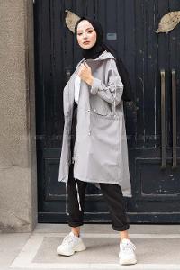 Lamelif Bel Lastikli Bağlama Detaylı Ceket Gri