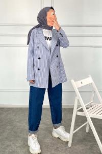 Modalamelif Önü Düğme Detaylı Çizgili Ceket Açık Mavi