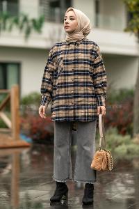 Modalamelif Önü Düğme Detaylı Tek Cepli Ekose Gömlek Bej