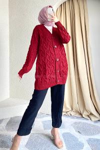 Modalamelif Önü Düğmeli Balık Sırtı Desen Triko Hırka Bordo