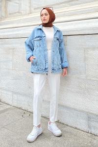 Lamelif Çıtçıtlı Vizonrengi Gömlek Yaka Detaylı Denim Ceket Kot Mavisi