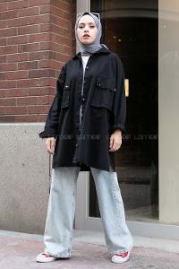 Modalamelif Önü Düğmeli Kapak Cepli Gabardin Gömlek Siyah