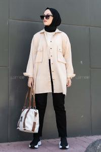 Modalamelif Önü Düğmeli Kapak Cepli Gabardin Gömlek Taş