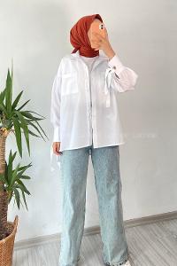 Lamelif Yanları İp Büzgülü Oversize Gömlek Beyaz