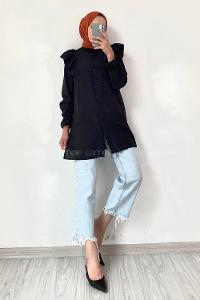 Modalamelif Önü Düğmeli Omuz Fırfır Detaytlı Gömlek Siyah