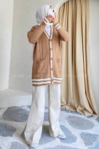 Modalamelif Önü Düğmeli Ribana Şeritli Çift Cepli Triko Hırka Sütlü Kahve
