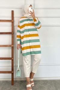Modalamelif Önü Düğmeli Şerit Modelli Çokrenkli Tunik Turuncu-Çağla Yeşili
