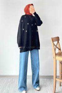 Lamelif Kalp Nakış Detaylı Oversize Hırka Siyah
