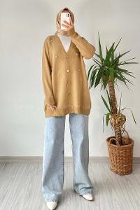 Modalamelif Önü Düğmeli Taş İşlemeli Triko Hırka Sütlü Kahve