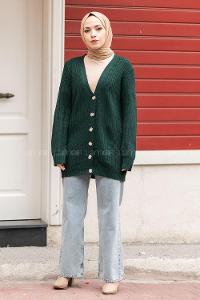Modalamelif Önü Düğmeli Uzun Triko Hırka Zümrüt Yeşili