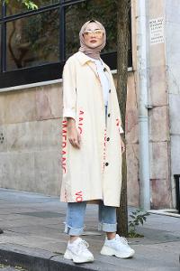 Modalamelif Önü Düğmeli Yazı Baskılı Trenç Bej