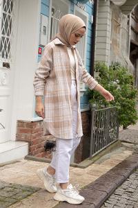 Modalamelif Önü Fermuarlı Ekose Desen Gömlek Bej Hardal