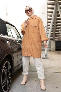Modalamelif Önü Fermuarlı Kapak Cepli Ceket Camel