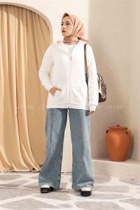 Lamelif Ön Fermuarlı Düz Sweatshirt Beyaz