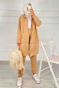 Modalamelif Önü Fermuarlı Kapşonlu İkili Takım Sütlü Kahve