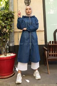 Modalamelif Önü Fermuarlı Kapşonlu Kot Kap Koyu Mavi