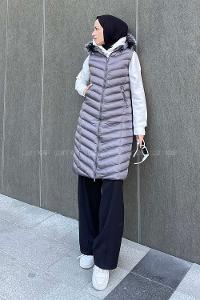 Modalamelif Önü Fermuarlı Kapüşonlu Çift Cepli Şişme Mont Yelek Gri