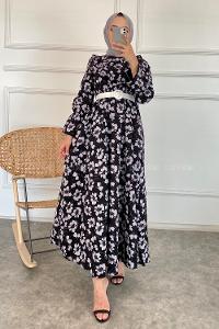 Lamelif Balon Kol Kemerli Tesettür Elbise Siyah