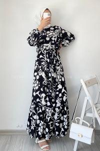 Lamelif Bel Büzgülü Tesettür Elbise Siyah
