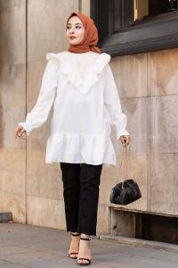 Modalamelif Önü Fırfır Detaylı Dantel Modelli Tunik Beyaz