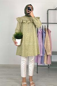 Omuz ve Göğüs Kısmı Fırfırlı Yarım Düğmeli Şık Tunik Çağla Yeşili