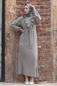 Lamelif Bel Büzgülü Tesettür Elbise Gri