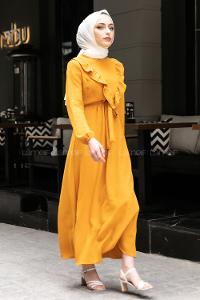 Lamelif Balon Kol Katlı Tesettür Elbise Sarı