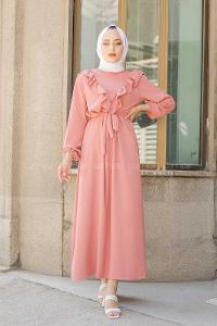 Lamelif Bel Büzgülü Tesettür Elbise Pembe