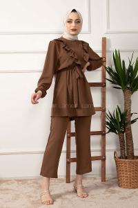 Modalamelif Önü Fırfırlı Kuşaklı İkili Takım Acı Kahve