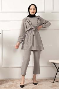 Modalamelif Önü Fırfırlı Kuşaklı İkili Takım Gri