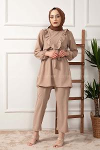 Modalamelif Önü Fırfırlı Kuşaklı İkili Takım Vizonrengi