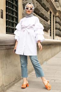 Modalamelif Önü Gizli Boydan Düğmeli Kolu FırFır Detaylı Gömlek Beyaz
