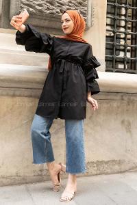 Modalamelif Önü Gizli Boydan Düğmeli Kolu FırFır Detaylı Gömlek Siyah