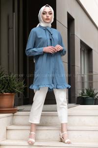 Modalamelif Önü Gizli Düğmeli Fırfırlı Tunik İndigo
